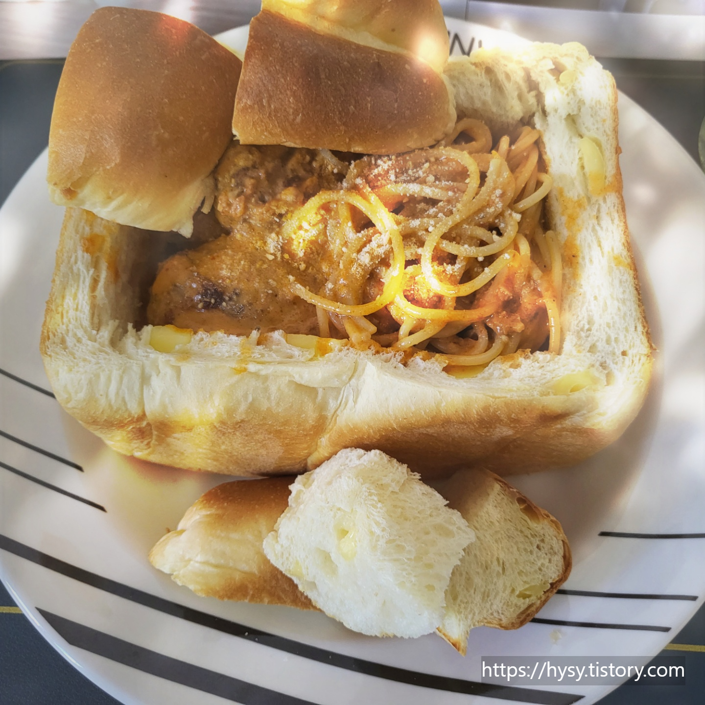 빵에 파스타 담아 파마산 치즈 가루 솔솔 뿌려 주면 완성~!